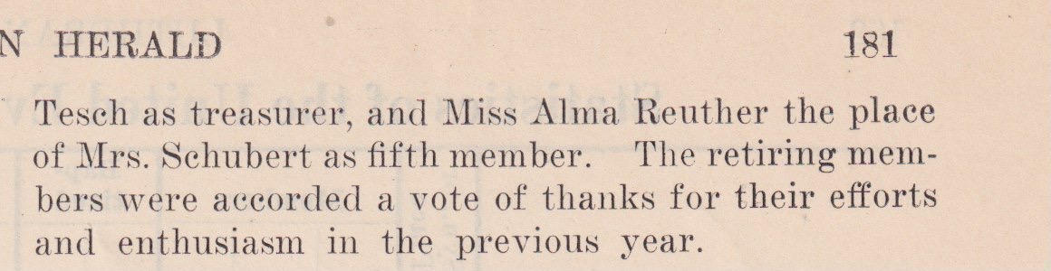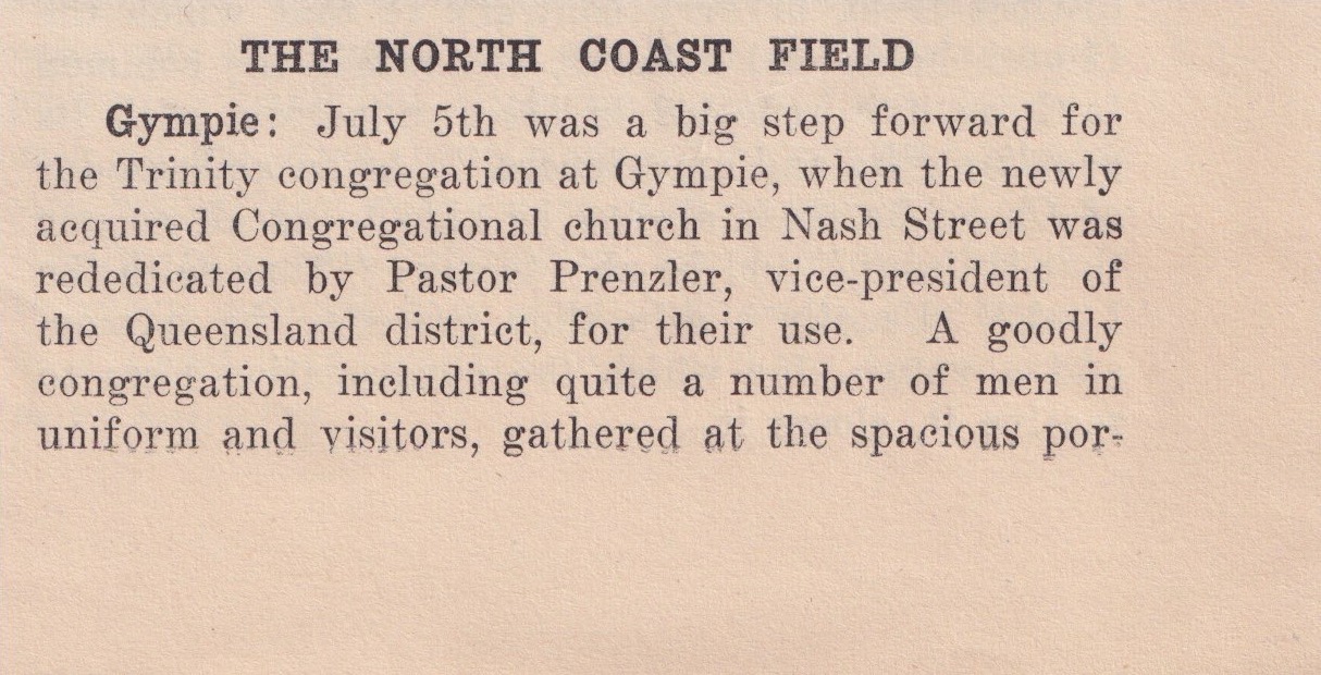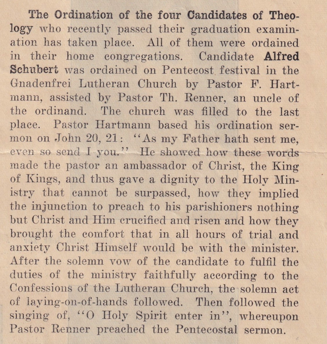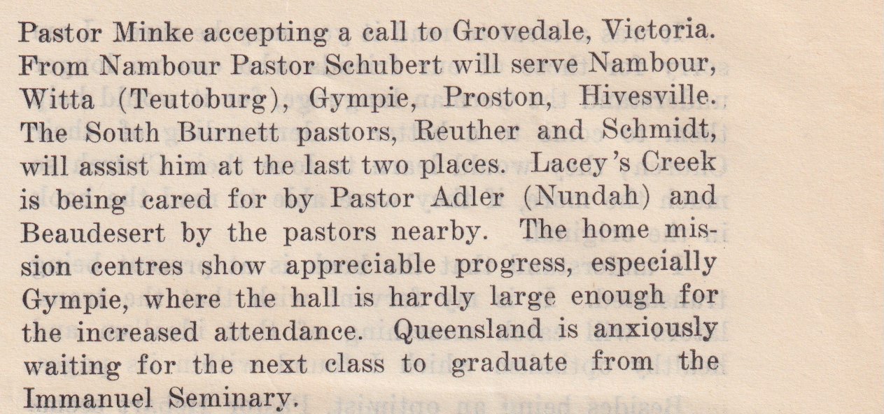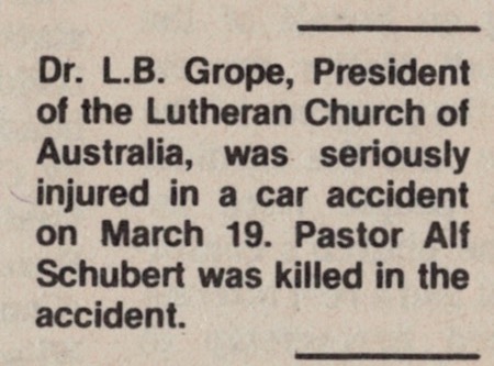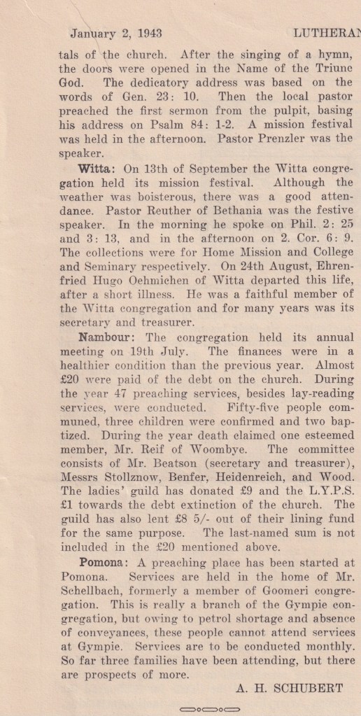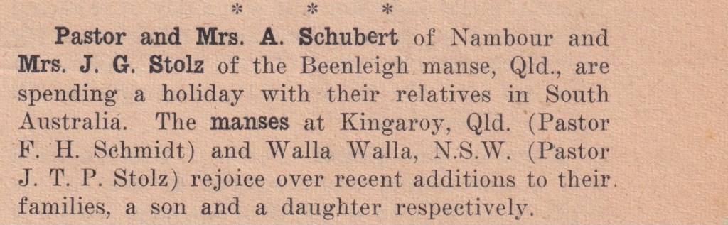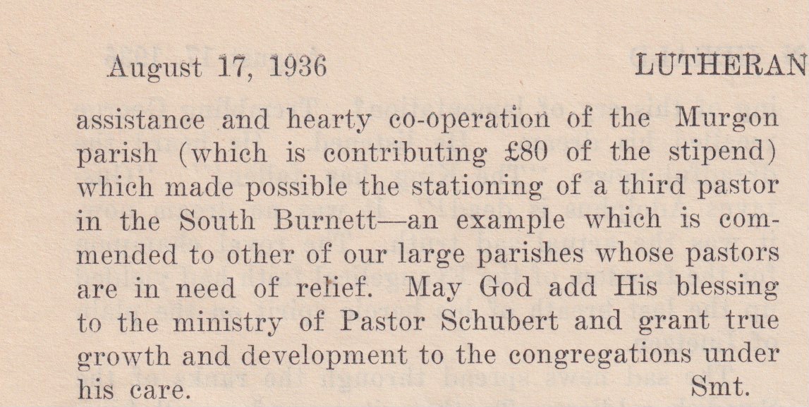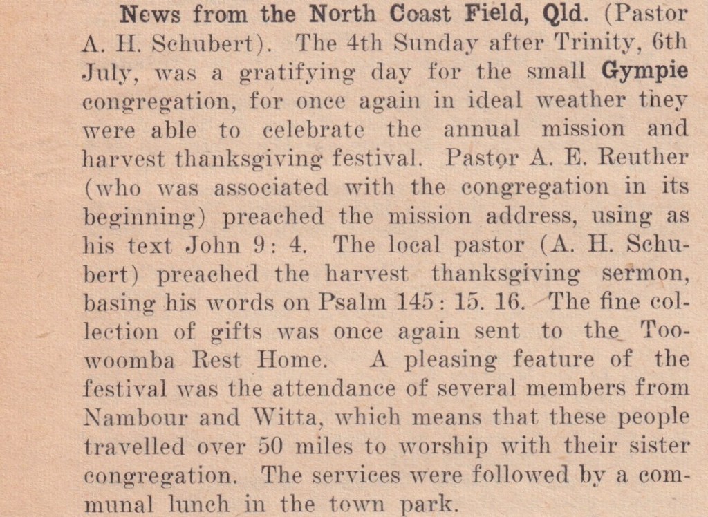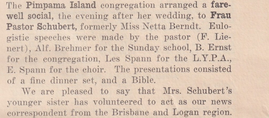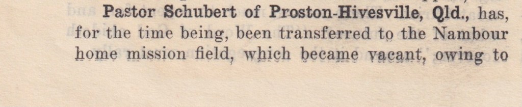 Published References (1.8.4.3 SCHUBERT) “Lutheran Herald” (Tanunda, SA), 12 March 1934, (extract from article “Students of Immanuel College and Seminary 1934”), page 90. “Lutheran Herald” (Tanunda, SA), 1 April 1935, (extract from article “Students of Immanuel College and Seminary 1935), page 103. “Lutheran Herald” (Tanunda, SA), 22 June 1936, (extract from article “From our Midst”), page 205. “Lutheran Herald” (Tanunda, SA), 17 August 1936, (extract from article “Installation Festival at Proston, Qld”), pages 268-269. “Lutheran Herald” (Tanunda, SA), 23 November 1936, (extract from article “From our Midst”), page 378. “Lutheran Herald” (Tanunda, SA), 24 October 1938, (extract from article “From our Midst”), page 345. “Lutheran Herald” (Tanunda, SA), 8 April 1940, (extract from article “From our Midst”), page 125. “Lutheran Herald” (Tanunda, SA), 22 April 1940, (extract from article “From our Midst”), page 143. “Lutheran Herald” (Tanunda, SA), 3 June 1940, (extract from article “Queensland Convention of L.Y.P.A.”), page 181. “Lutheran Herald” (Tanunda, SA), 3 February 1941, (extract from article “From our Midst”), page 45. “Lutheran Herald” (Tanunda, SA), 4 August 1941, page 143, (extract from article “From our Midst”), page 143. “Lutheran Herald” (Tanunda, SA), 2 January 1943, (extract from article “Our Queensland Home Missioners tell us about their Fields”), pages 8-9. “Lutheran Herald” (Tanunda, SA), 28 September 1946, (extract from article “From our Midst”), page 315. Probably “Border Morning Mail” (Wodonga, Vic.), Wednesday 5 May 1982 [Elvie Tilley (Schache)]. Probably “Border Morning Mail” (Wodonga, Vic.), Wednesday 9 March 1983 [Elvie Tilley (Schache)] “Border Morning Mail” (Wodonga, Vic.), Monday 21 March 1983, page 3 [Elvie Tilley (Schache)]. Probably “Border Morning Mail” (Wodonga, Vic.), March 1983 (“Deaths”) [Elvie Tilley (Schache)]. “Lutheran” (Adelaide, SA) 18 April 1983, page 6. “Australian Christian” (National Journal of Churches of Christ in Australia), 23 April 1983 (extract from article “Happenings”). “District Notes” (Victoria/Tasmania District, Lutheran Church of Australia), 10 July 2013.