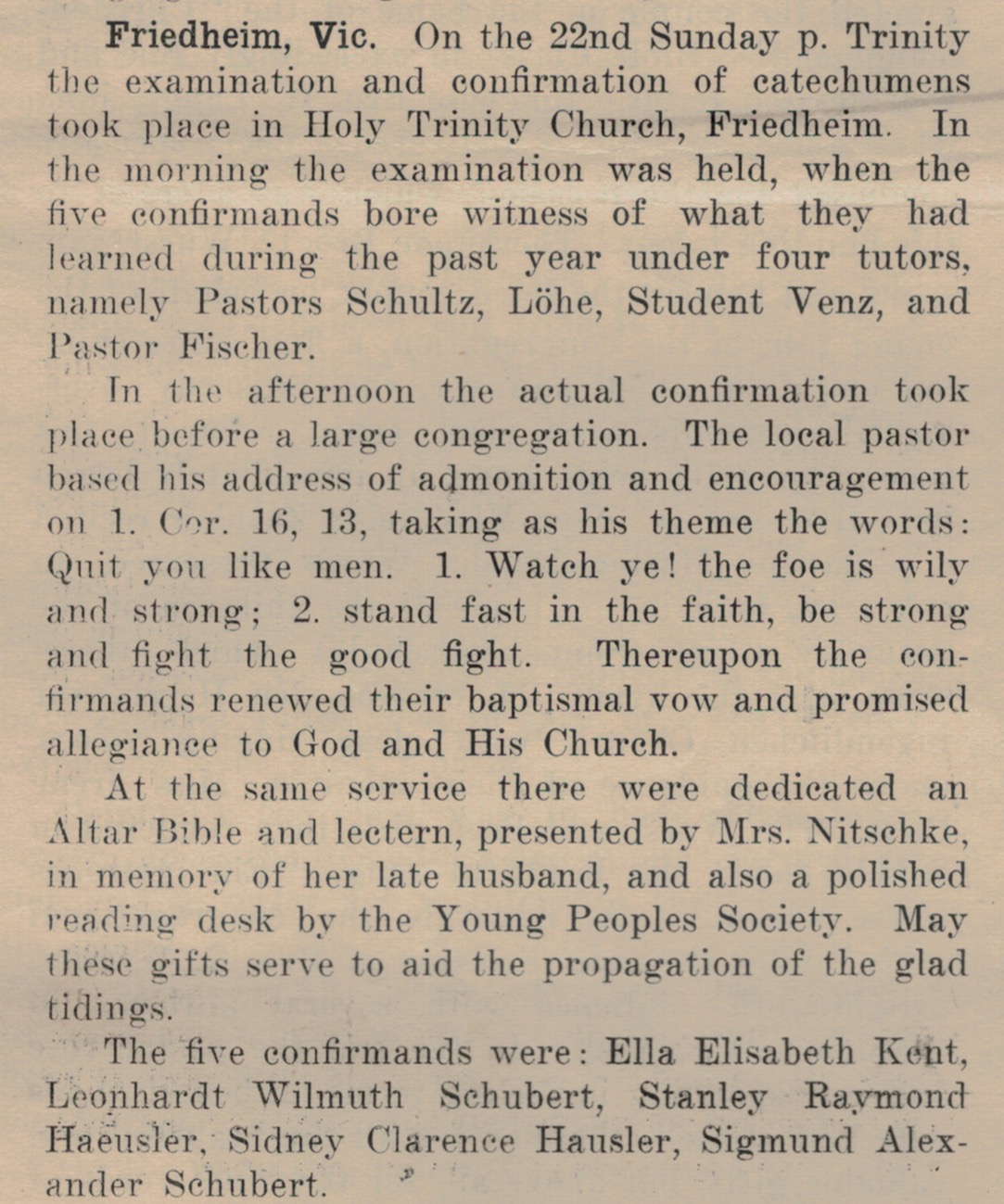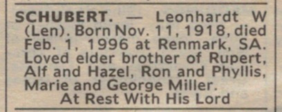 Published References (1.8.9.1 SCHUBERT) “Lutheran Herald” (Tanunda, SA), 13 December 1933, page 411. “Herald-Sun” (Melbourne. Vic.), Monday 5 February 1896 (“Deaths”).