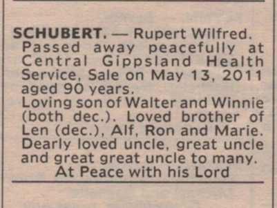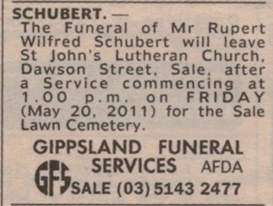 Published References (1.8.9.2 SCHUBERT) Lutheran Parish Newsletter (Sale, Yarram, Bairnsdale, Vic.) Sunday 25 June 2000, page 3. “Herald Sun” (Melbourne, Vic.), Monday 16 May 2011, page 58 (“Deaths”). “Herald Sun” (Melbourne, Vic.), Monday 16 May 2011, page 60 (“Funeral Notices”).