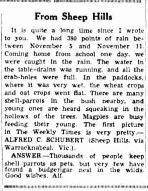 Published References (1.8.9.3 SCHUBERT) “Weekly Times” (Melbourne, Vic.), Saturday 16 June 1934, page 39 (extract from “M Letter”). “Weekly Times” (Melbourne, Vic.), Saturday 4 August 1934, page 30. “Weekly Times” (Melbourne, Vic.), Saturday 26 January 1935, page 28.