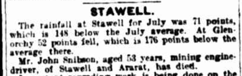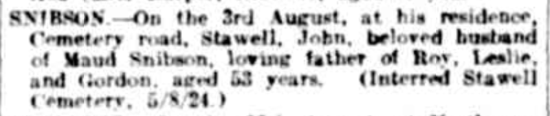 Published References (1.8 SNIBSON) “Argus” (Melbourne, Vic.), Saturday 9 August 1924, page 16 (extract) [Trove]. “Argus” (Melbourne, Vic.), Saturday 16 August 1924, page 17 (“Deaths”) [Trove].