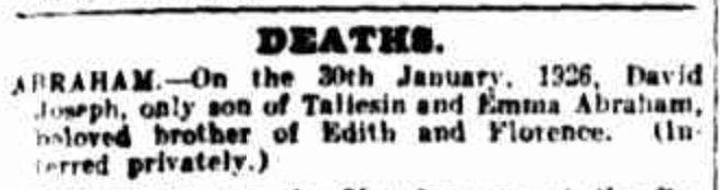 Published References (1.9.2 ABRAHAM) “Age” (Melbourne, Vic.), Monday 1 February 1926, page 1 [Trove].