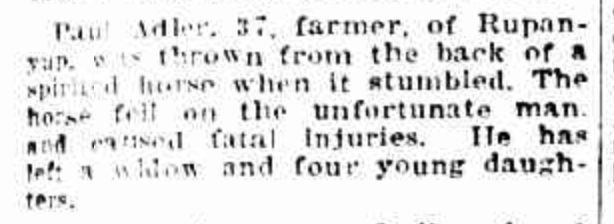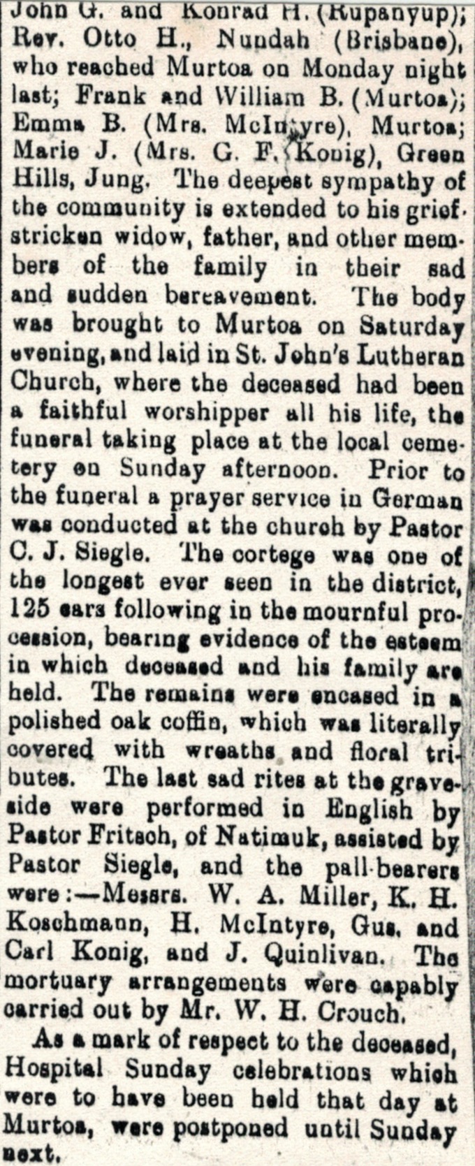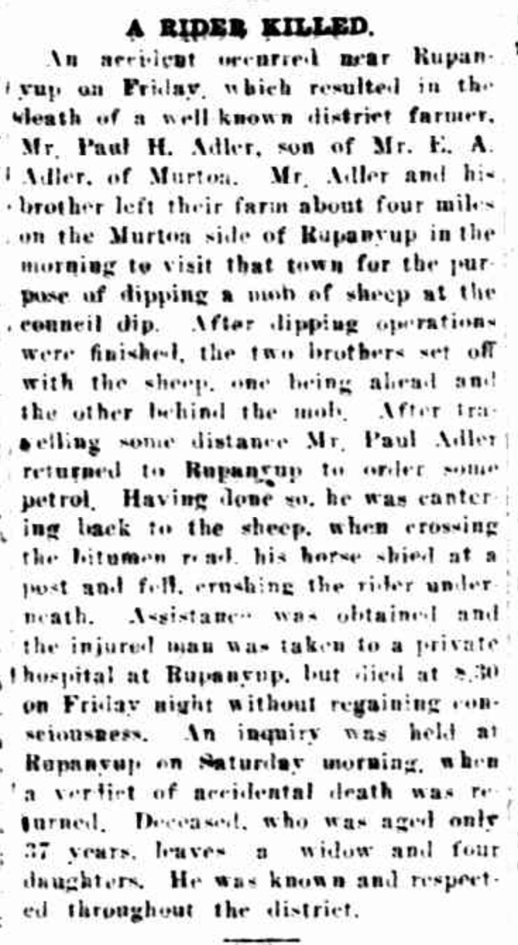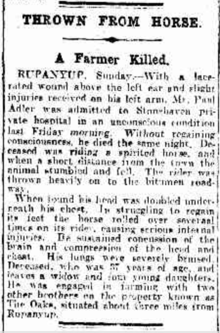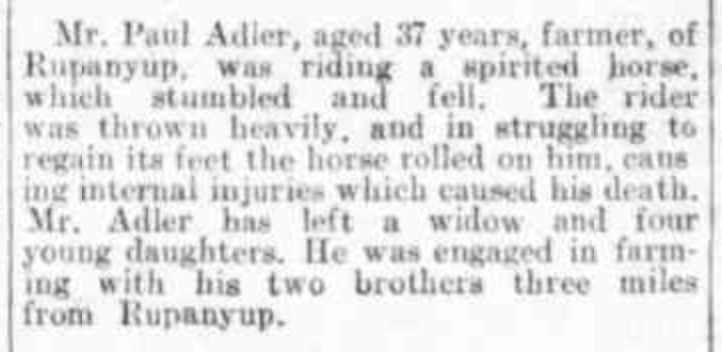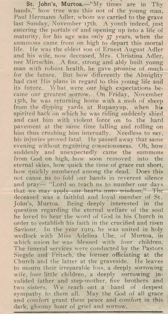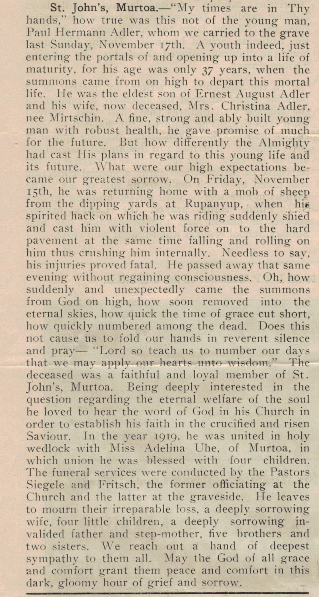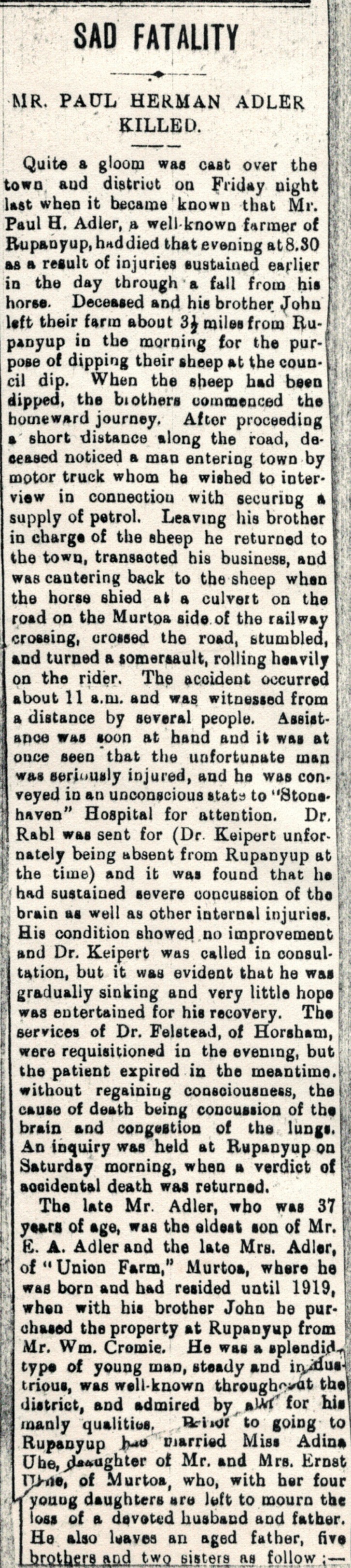 Published References (1.9.2 ADLER) “Age” (Melbourne, Vic.), Monday 18 November 1929, page 12. “Argus” (Melbourne, Vic.), Monday 18 November 1929, page 8. “Horsham Times” (Vic.), Tuesday 19 November 1929, page 2. “Horsham Times” (Vic.), Tuesday 19 November 1929, page 2. “Dunmunkle Standard and Murtoa Advertiser” (Vic.) Friday 22 November 1929 [Irma Russell (Schache)]. “Weekly Times” (Melbourne, Vic.), Saturday 23 November 1929, page 9 (extract from article “Australasian News in a Nutshell”). “Australasian” (Melbourne, Vic.), Saturday 23 November 1929, page 11 (extract from “Victorian News”). “Lutheran Herald” (Tanunda, SA), 9 December 1929, page 398 (extract from article “From Our Midst”). “Age” (Melbourne, Vic.), Wednesday 5 February 1930, page 12 (extract of article).