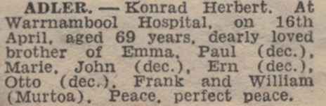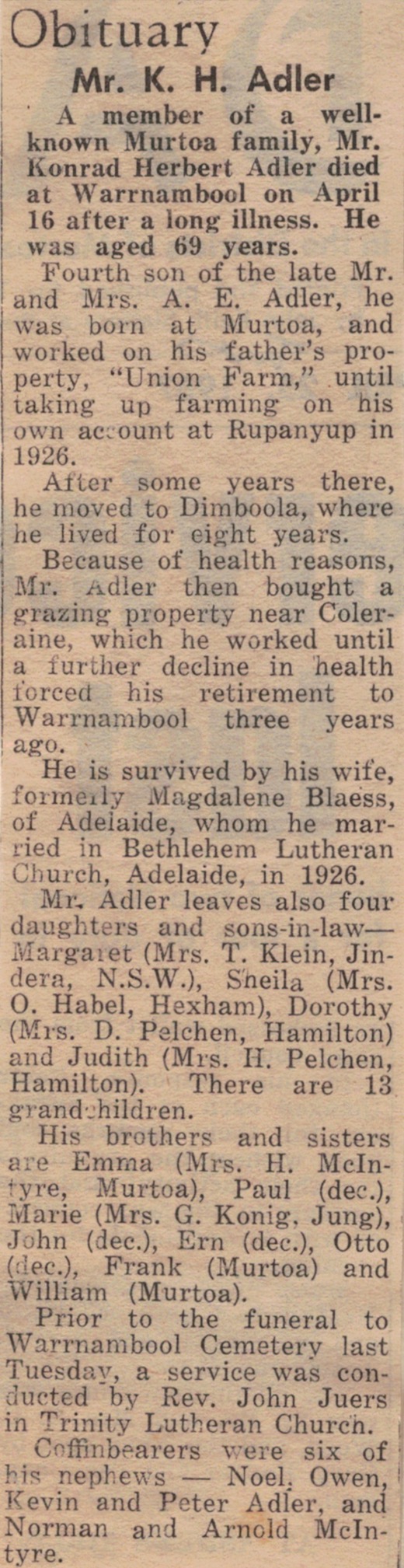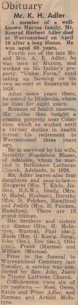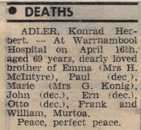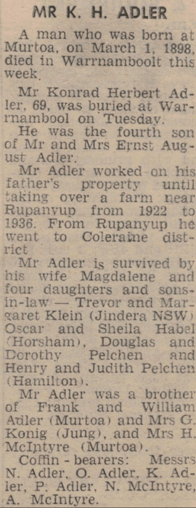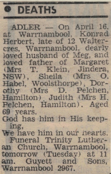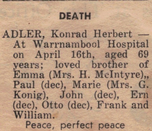 Published References (1.9.6 ADLER) ‘Wimmera Mail-Times” (Horsham, Vic.), Monday 17 April 1967. “Sun” (Melbourne, Vic.), Tuesday 18 April 1967 (“Deaths”). ‘Wimmera Mail-Times” (Horsham, Vic.), Wednesday 19 April 1967. “Wimmera Mail-Times” (Horsham, Vic.), Friday 21 April 1967. “Dunmunkle Standard” (Murtoa, Vic.), Tuesday 25 April 1967. “Dunmunkle Standard” (Murtoa, Vic.), Tuesday 25 April 1967.