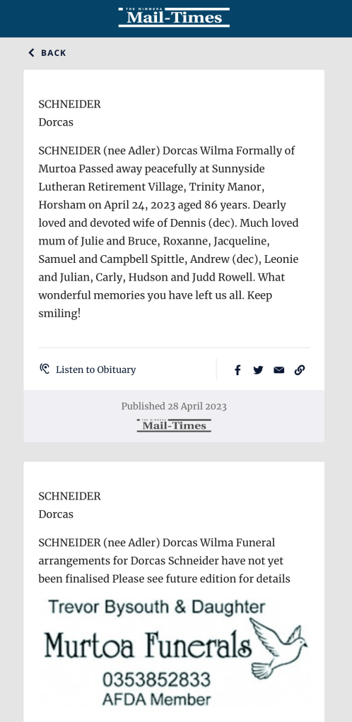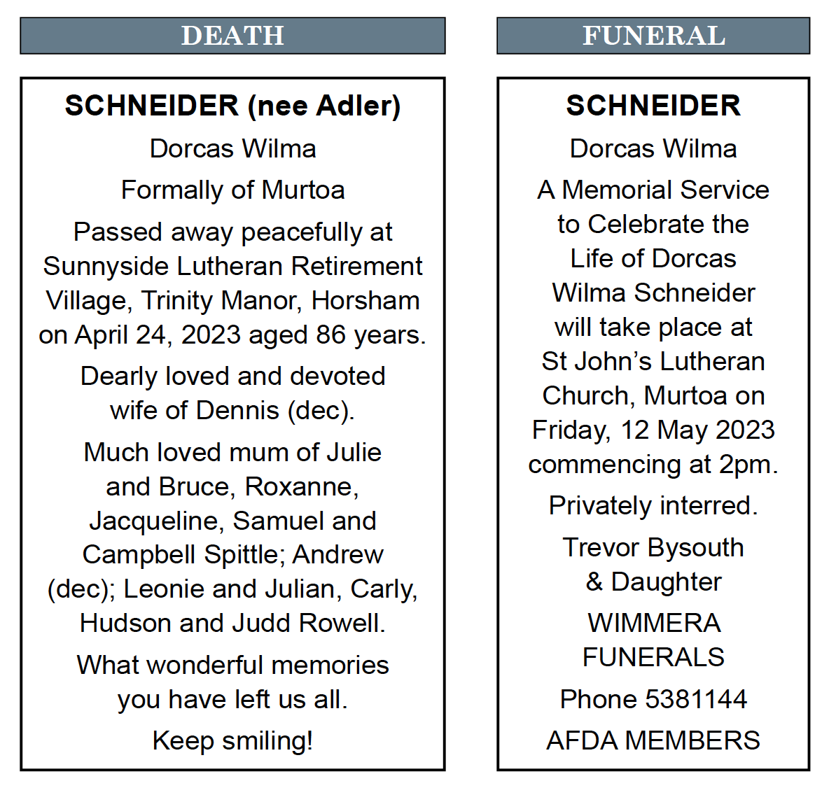 Published References (1.9.8.1 ADLER) “Murtoa and District Advertiser” (Vic.), 4 May 2023, page 16. “Wimmera Mail-Times” (Horsham, Vic.), Friday 28 April 2023 [Internet Death and Funeral notices].
