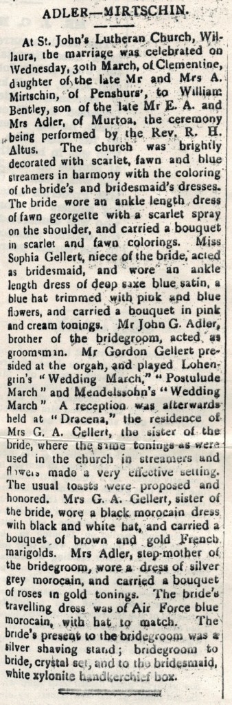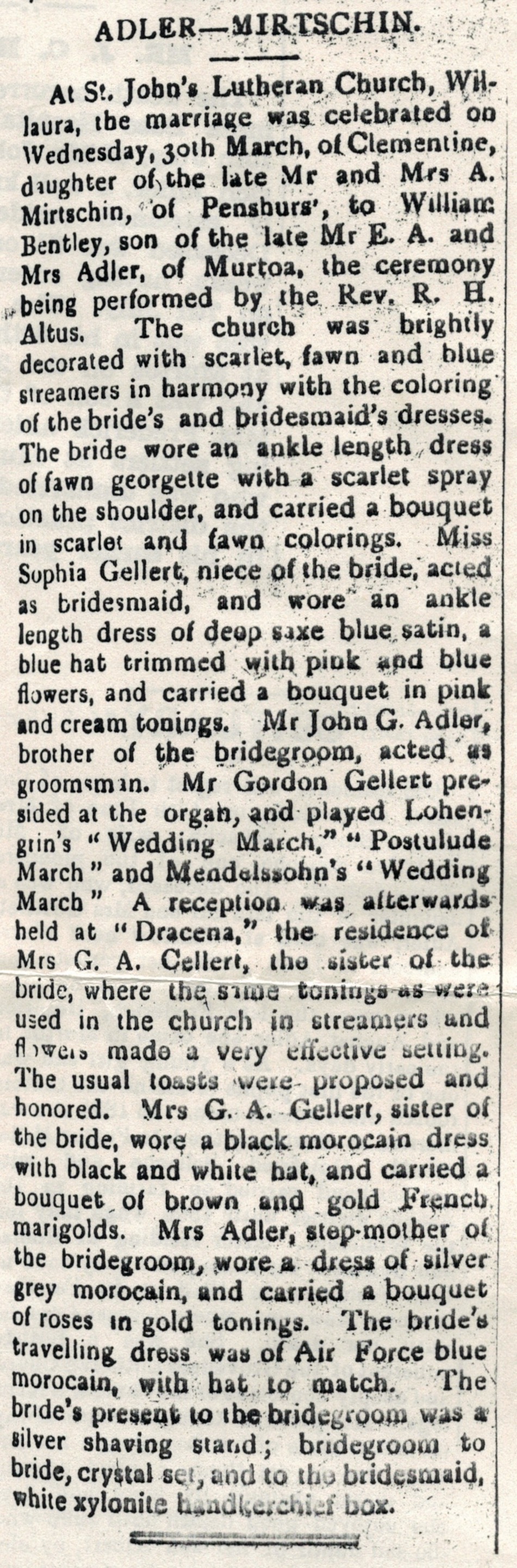Published References (1.9.9 ADLER) “Dunmunkle Standard and Murtoa Advertiser” (Vic.), Friday, 15 April 1932. “Dunmunkle Standard and Murtoa Advertiser” (Vic.), Friday 21 October 1955, page 8 (part of article) [ Tess Hausler (Schache)].