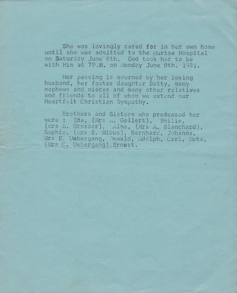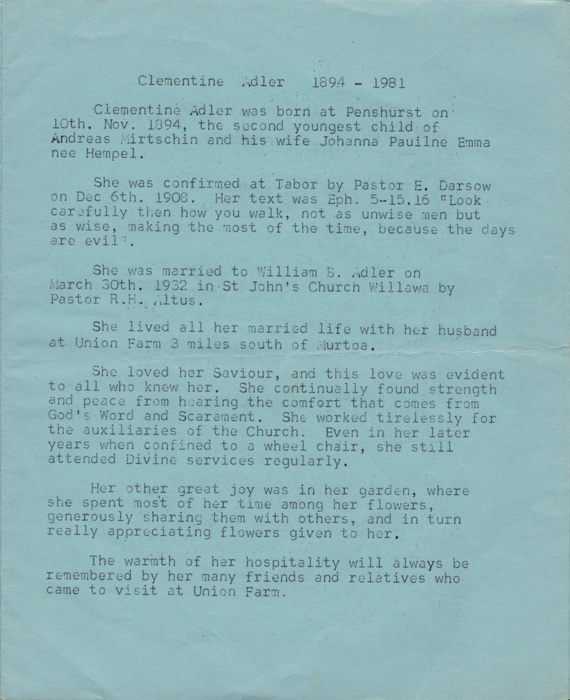 Published References (1.9.9 ADLER) Funeral service order for Clementine Adler (Mirtschin), Murtoa, Vic., 1981.