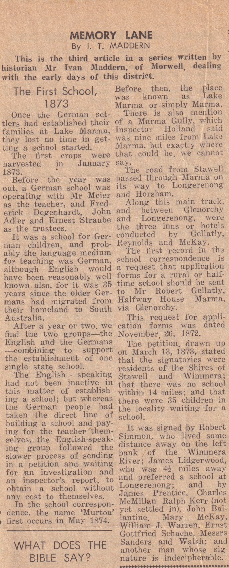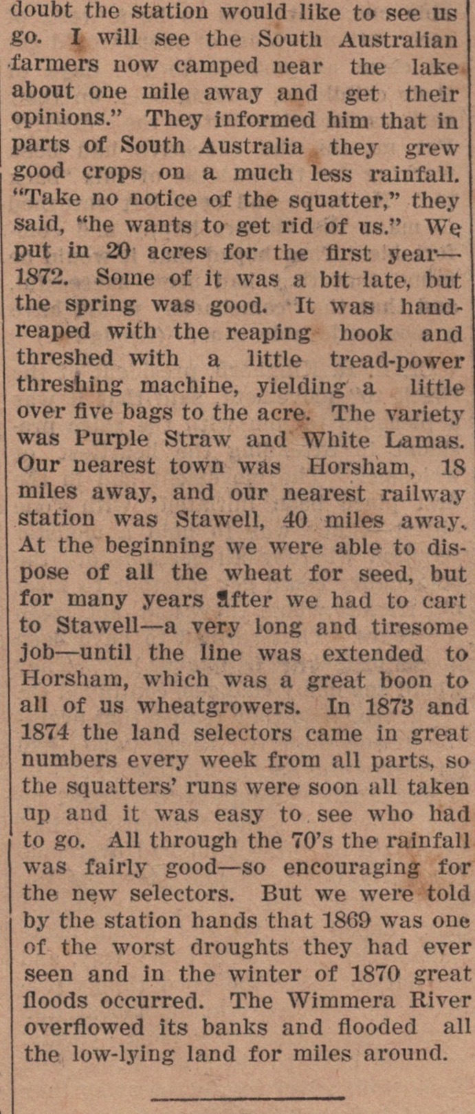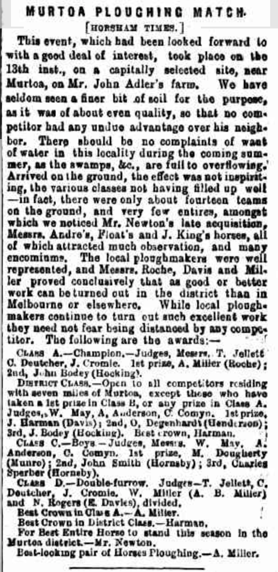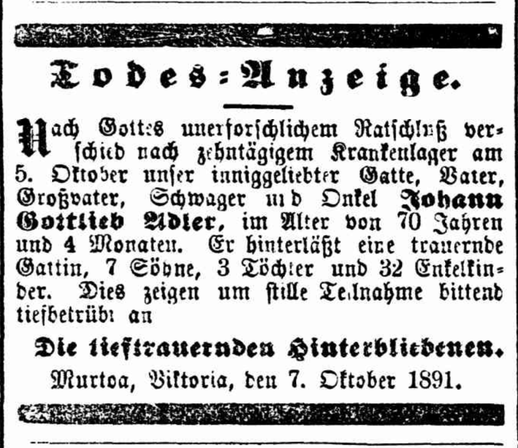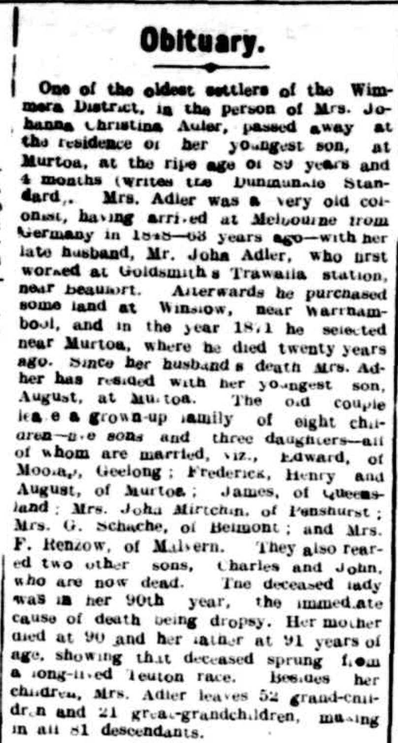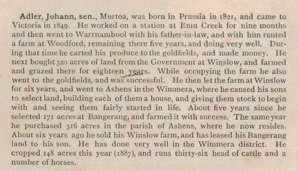 Published References (1. ADLER) “Leader” (Melbourne, Vic.), Saturday 24 August 1878, page 8 [Trove]. “Australasian” (Melbourne, Vic.), Saturday 24 August 1878, page 24 [Trove]. “Victoria and It’s Metropolis Past amd Present” Vol. II, Melbouurne, McCarron,Bird and Co., 1888, page 100 (Wimmera District/East). “Horsham Times” (Vic.), Tuesday 20 October 1891, page 3 (extract from article) [Trove]. “Australische Zeitung” (Adelaide, SA), Wednesday 18 November 1891, page 5 (“Advertising”) [Trove]. “Horsham Times” (Vic.), Tuesday 7 November 1911, page 5 [Trove]. “Warracknabeal Herald (Vic.) Review of Back to Warracknabeal & District, March 2-9, 1933”, page 3. “Murtoa and District Advertiser”, Wednesday 2 July 1975.