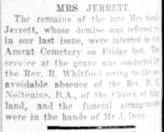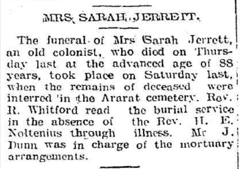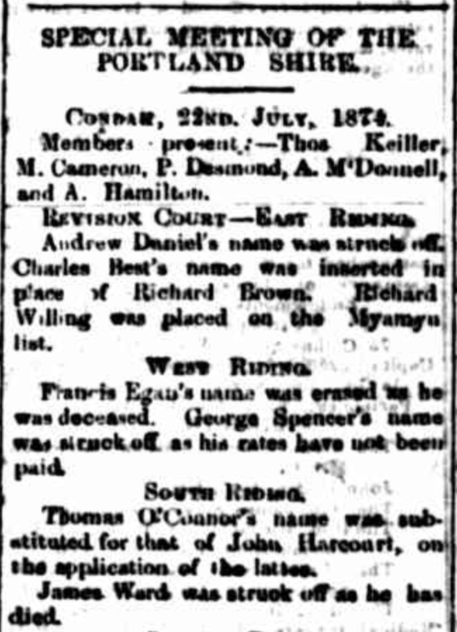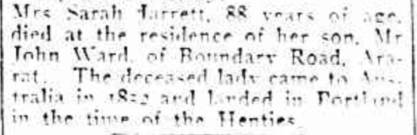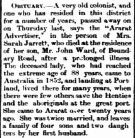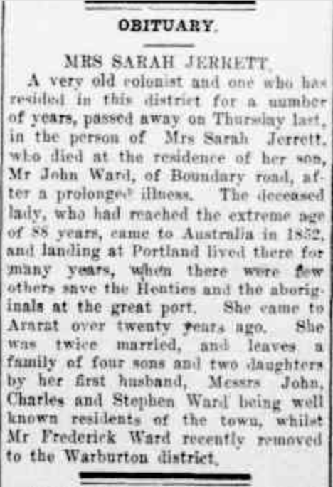 Published References (1. WARD) “Portland Guardian and Normanby General Advertiser” (Vic.), Friday 24 July 1874, page 2 (extract) [Trove]. “Ballarat Courier” (Vic.), Wednesday 3 September 1884, page 3 [Trove]; also published in the same paper, Friday 5 September, page 3. “The Ararat Advertiser” (SA), Saturday 26 May 1917, page 2 [Trove]. “Ararat Chronicle and Willaura and Lake Bolac Districts Recorder” (Vic.), Tuesday 29 May 1917, page 2 (extract from article “Obituary’); “The Ararat Advertiser” (Vic.) Tuesday 29 May 1917, page 2 (extract from article “Obituary”) [Trove]. “Portland Observer and Normanby Advertiser” (Portland, Vic.), Monday 4 June 1917, page 2 [Trove]. “Port Fairy Gazette” (Vic.), Thursday 7 June 1917, page 2 (extract from article “Portland”) [Trove].