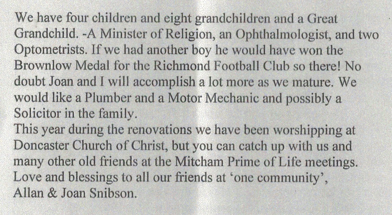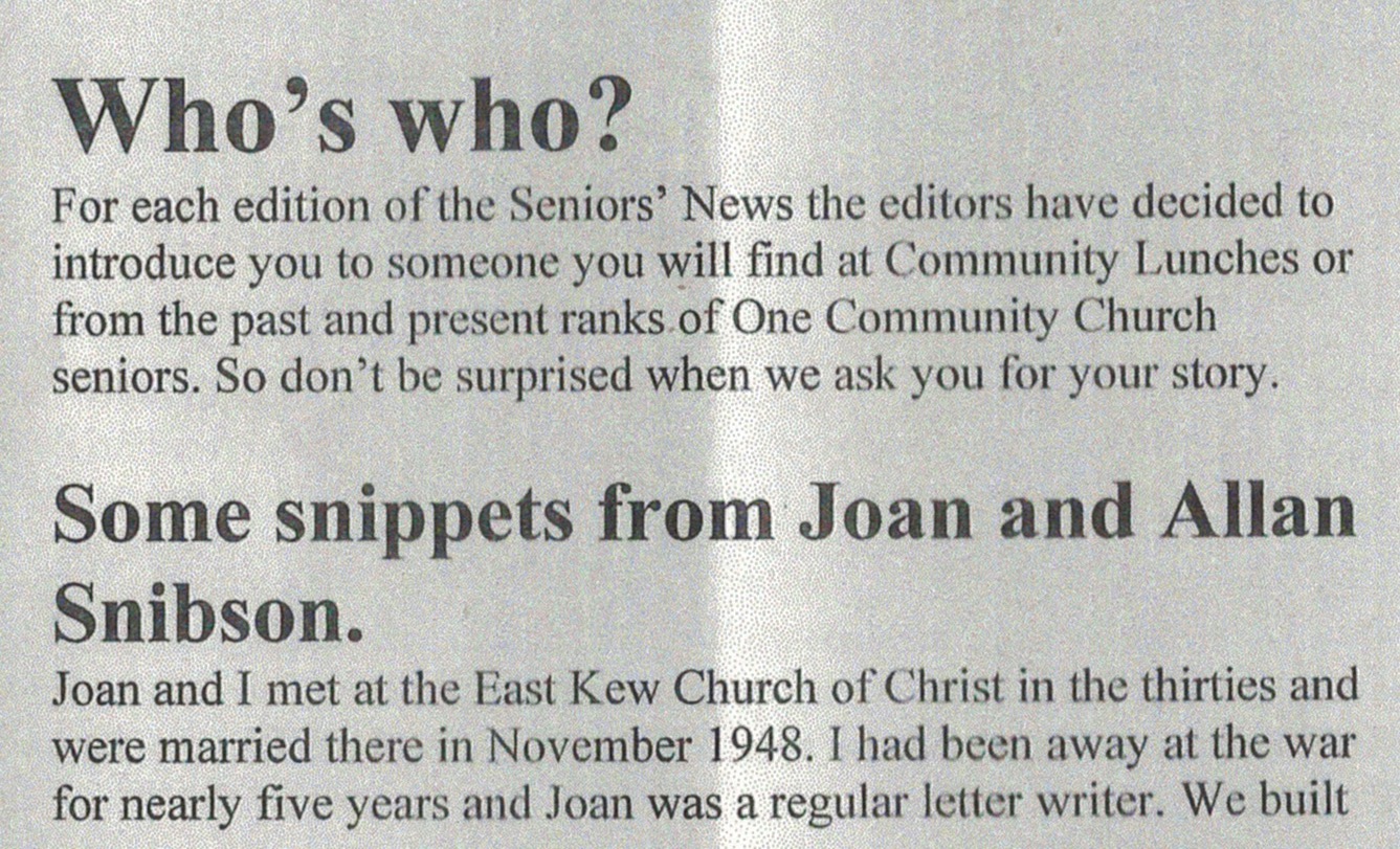 Published Writing (1.6.1.2 SNIBSON) “Active Seniors and Compass Care Newsletter” (One Community Church/ Blackburn Church of Christ), November 2007.