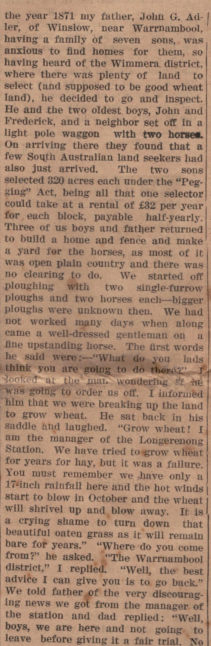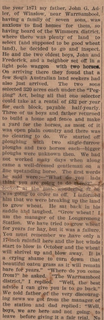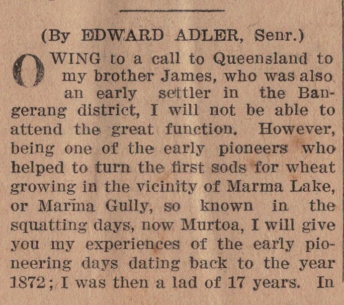 Published Writings (1.6 ADLER) “Warracknabeal Herald (Vic.) Review of Back to Warracknabeal & District, March 2-9, 1933”, page 3. This article was reproduced in “Murtoa Centenary 1872-1972: A Century of Development” (ed. L. H. Rabl), page 7 [JAS].