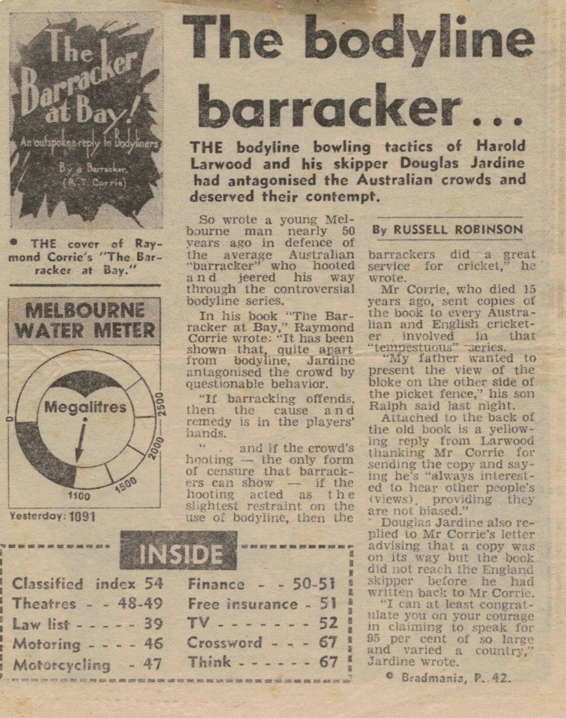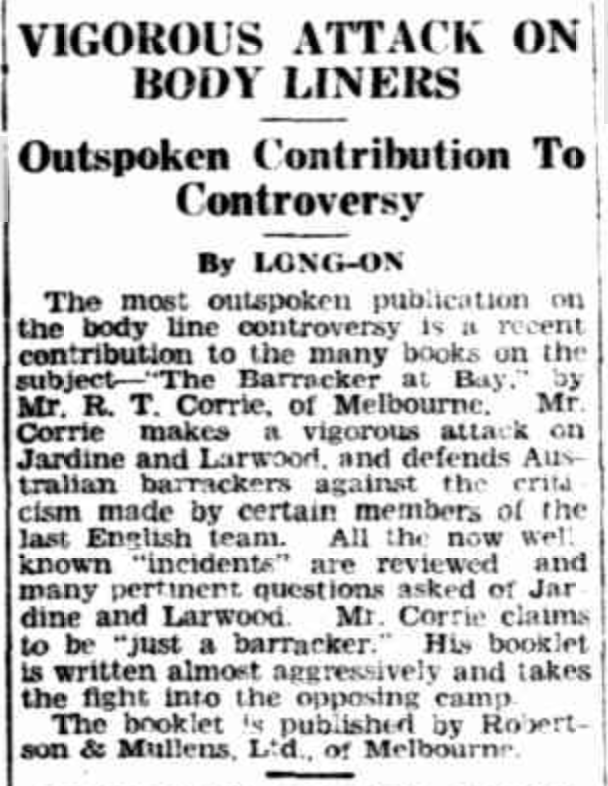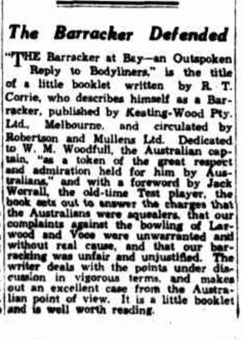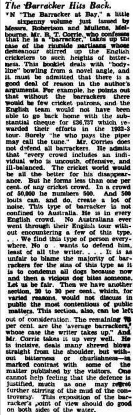 “The Barracker at Bay!” Press References: “Advertiser” (Adelaide, SA), Friday 8 September 1933, page 10 [Trove]. “Sporting Globe” (Melbourne, Vic.), Saturday 9 September 1933, page 6 [Trove]. “Queenslander” (Brisbane, Qld.), Thursday 21 September 1933, page 15 [Trove]. “Sun” (Melbourne, Vic.), page 2.